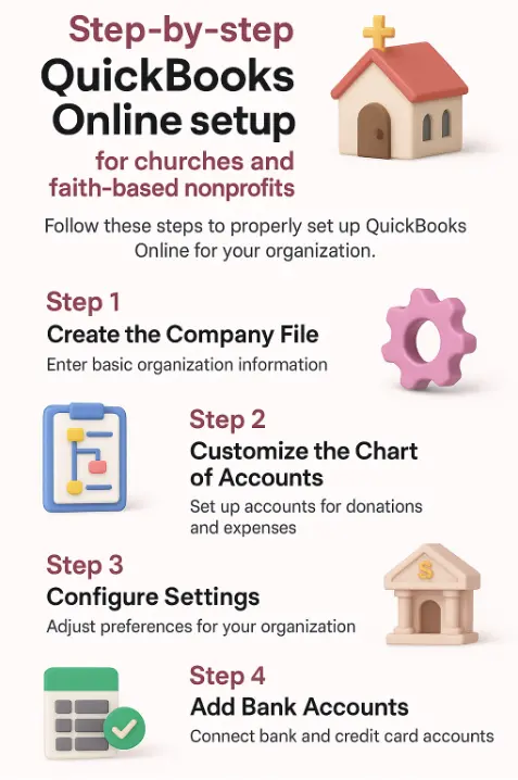 After helping dozens of churches and faith-based nonprofits transition into QuickBooks Online, we’ve seen the same problem again and again—ministries are handed generic setup steps that don’t reflect the realities of tracking giving, managing designated funds, or maintaining donor transparency. At Accountix Solutions, we build QBO files for ministries every week, and we know exactly which settings simplify your workflow and which ones create headaches later. With our deep experience in nonprofit accounting, this step-by-step guide distills what we’ve learned in real client setups, giving you a clear, ministry-specific QuickBooks Online framework that keeps your finances organized, compliant, and aligned with the way churches actually operate.